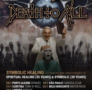 Death To All, projeto/turnê-tributo com ex-membros da banda norte-americana Death, está no Brasil para celebrar ao vivo os clássicos álbuns Spiritual Healing e Symbolic, que respectivamente completam 35 e 30 anos desde seus lançamentos na década de 1990. A turnê acontece de 20 a 25 de janeiro em cinco cidades.