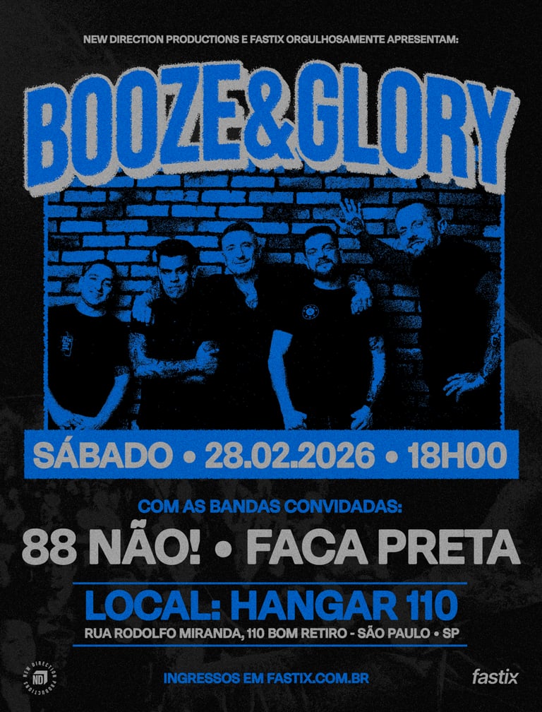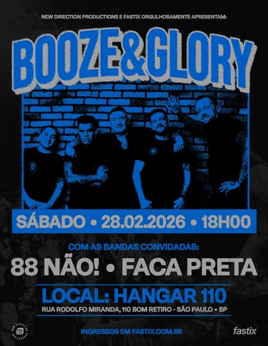 A banda britânica Booze & Glory, nome da primeira divisão do street punk mundial, retorna a São Paulo/SP no dia 28 de fevereiro. O show será no Hangar 110 e as bandas de abertura, nomes fortes e exaltados no street punk nacional, estão confirmadas: Faca Preta e 88 Não!