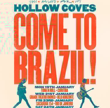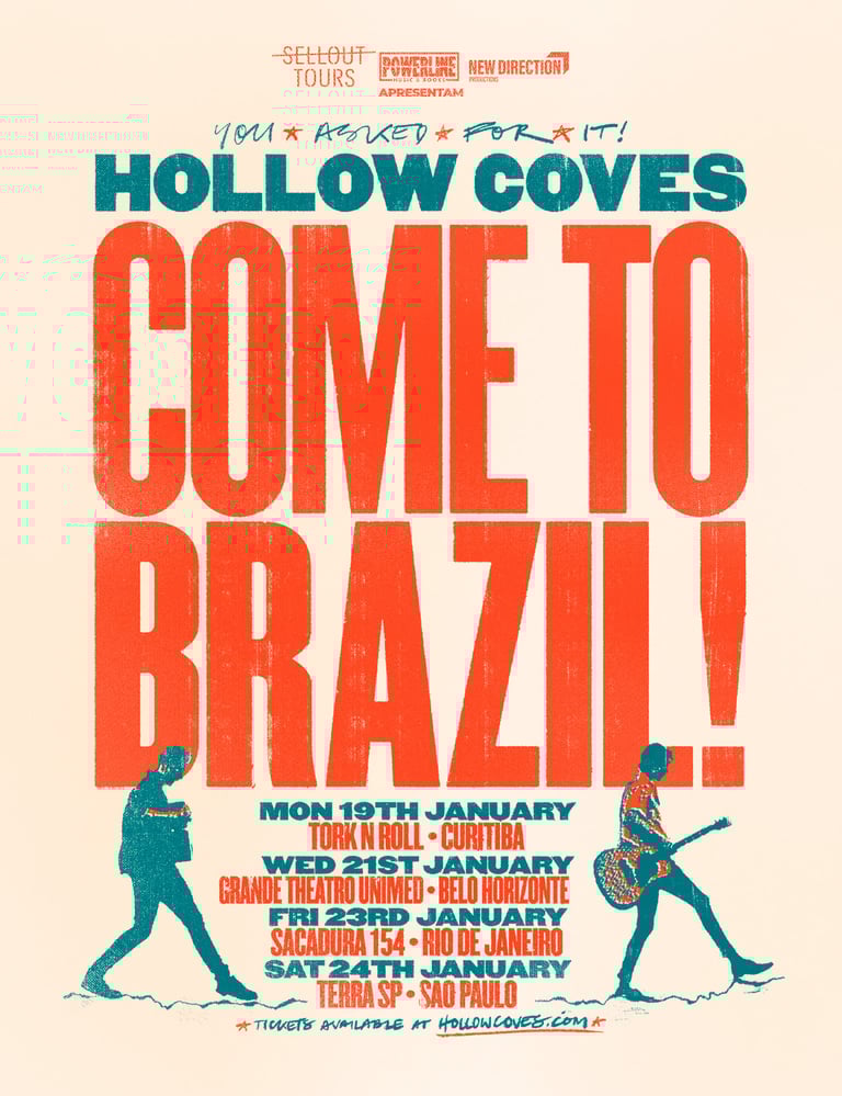 As produtoras Sellout Tours, Powerline Music & Books e ND Productions anunciam a estreia do duo australiano Hollow Coves no Brasil, em janeiro de 2026. Conhecidos por seu indie-folk envolvente e inspirador, Matt Carins e Ryan Henderson farão quatro apresentações no país: Curitiba (19/01), Belo Horizonte (21/01), Rio de Janeiro (23/01) e São Paulo (24/01).