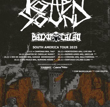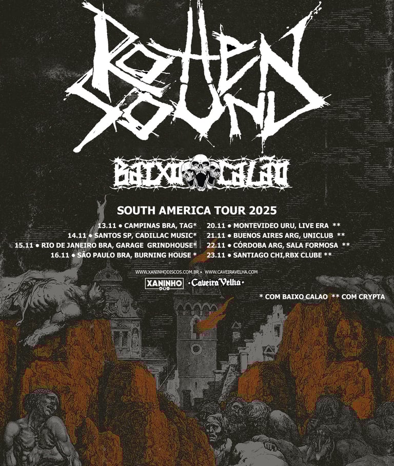 Os finlandeses do Rotten Sound, uma das forças do grindcore mundial desde 1993, desembarcam na América do Sul em novembro deste ano para oito apresentações, entre elas, quatro no Brasil com a participação da banda nacional de grindcore Baixo Calão. A realização da parte nacional da turnê é da Xaninho Discos em parceria com a Caveira Velha.