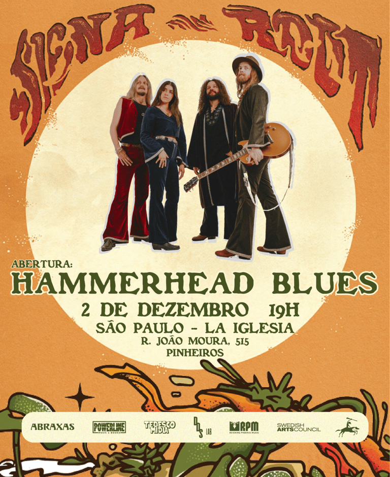 Os suecos, antes, se apresentam dia 29/11 no Rio de Janeiro/RJ, no La Esquina (Lapa), a partir das 20h. A banda de abertura é a Muladhara, do selo da Abraxas Records. Ingressos: sympla.com.br/evento/siena-root-29-de-novembro-no-rio-de-janeiro/3170163.