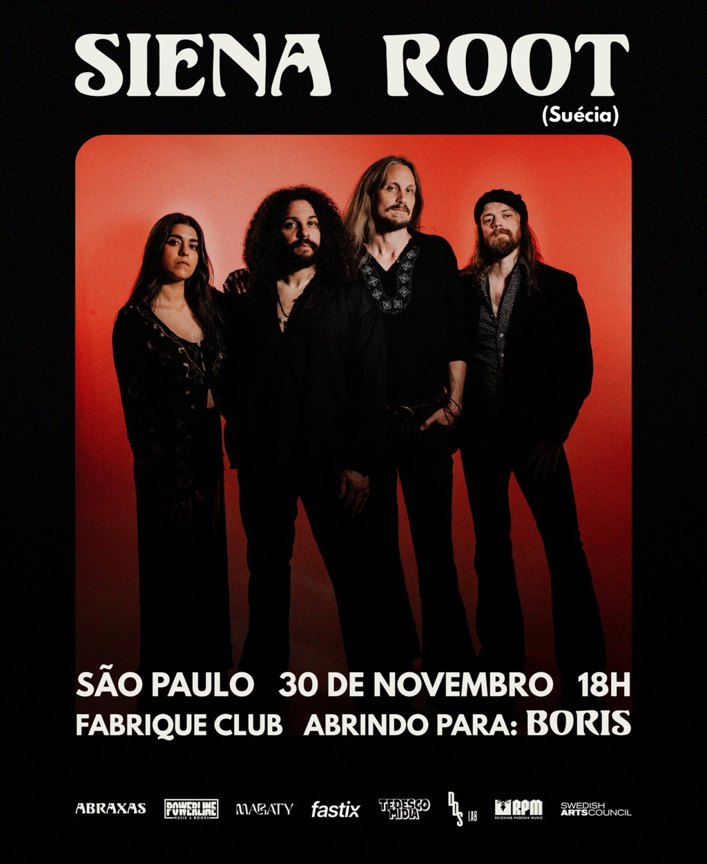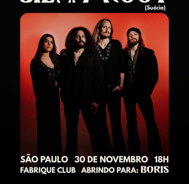 Siena Root, quarteto sueco pioneiro do rock vintage, enfim desembarca no Brasil em novembro como banda convidada da também inédita apresentação da lenda japonesa Boris em São Paulo. O show acontece dia 30/11 no Fabrique Club e faltam poucos ingressos para atingir a lotação máxima da casa. A produção é conjunta entre Powerline Music & Books, Abraxas e Maraty.
