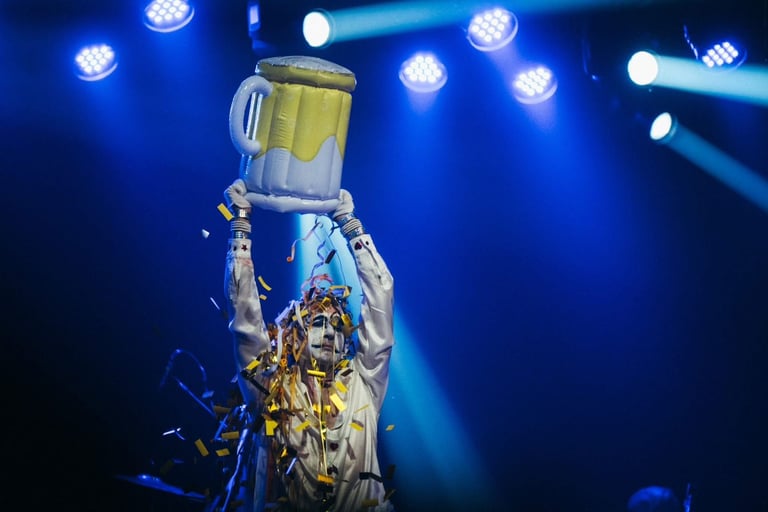 Se tudo parece uma performance circense, era hora de Monkey pegar uma jarra inflável gigante, e interagir com a platéia em Who Split My Beer.