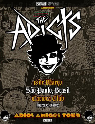 Popular e ativa no punk rock desde a década de 1970 e com estética inspirada no filme Laranja Mecânica, a banda inglesa The Adicts enfim traz a São Paulo/SP, no dia 18 de março, a Adios Amigos Tour, a despedida pela América Latina depois de quase cinco décadas de carreira. O show acontece no Carioca Club com realização da Powerline Music & Books e Heart Merch.